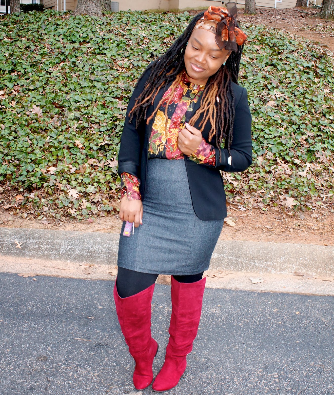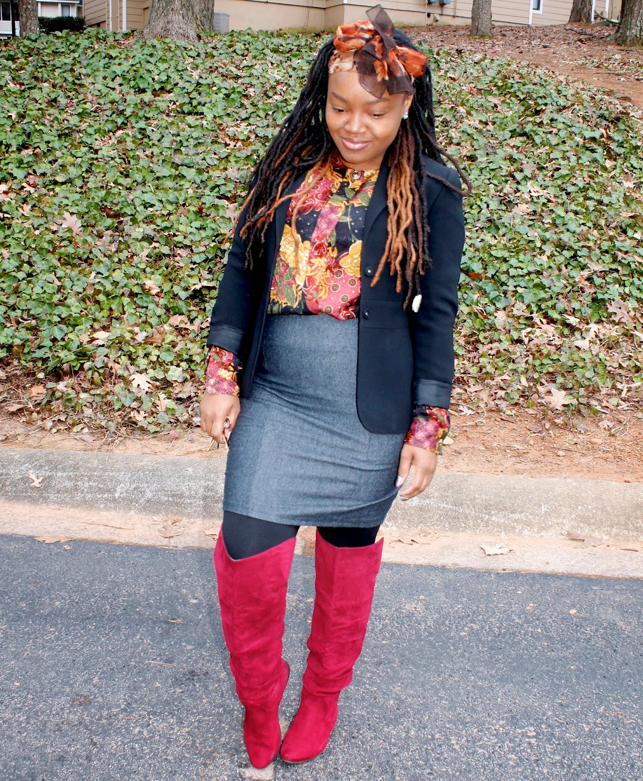 Skirt, Blouse, & Blazer: Thrifted…. Boots: ShoeDazzle…. Head-Scarf: Ross… Tights: F21